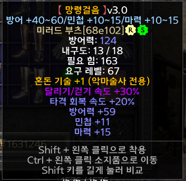 망령걸음 혼돈 방어준으뜸 59 민첩11 마력15 으뜸 팝니다