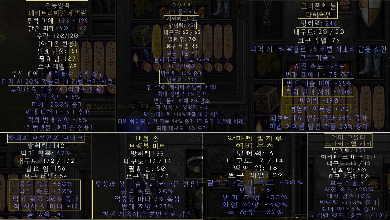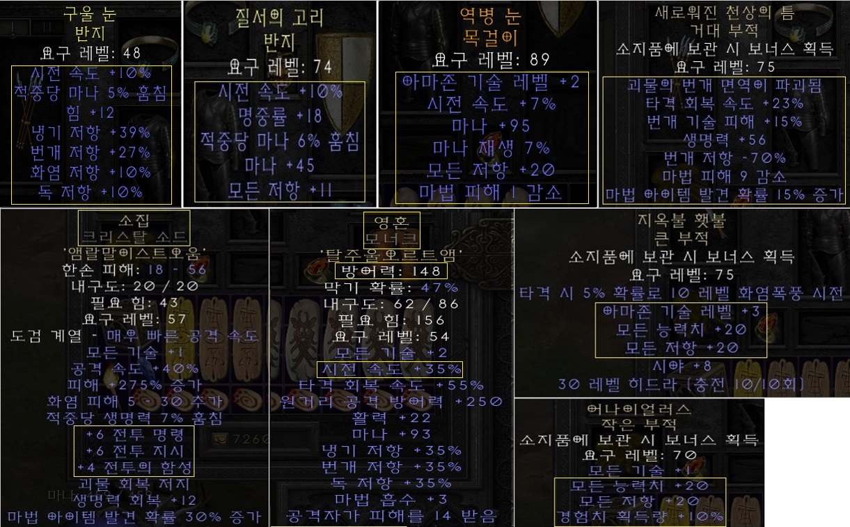 ![]() 쪽지는 연락하기 힘들어요!! 배틀태그 친추나 오픈카톡으로 연락부탁드립니다! 배틀태그 : Rodri#31842 오픈카톡 : https://open.kakao.com/o/sQj7Wv4g ------------------------------------------------------------------------------------ 이번 dlc에서 -10라깍/10라뎀의 엄청난 수치를 챙겨올 수 있는 감시자의 천둥(신규주얼, 우버주얼)로 인해 다뎀에 15공속15올레 주얼작하기 보다는 '신규주얼작'을 한 이후 '신탄'으로 공속과 라깍을 더 챙겨오는 것이 최신 메타입니다. 그리고 '신규파괴참' 또한 필수템이죠. ###스펙 정리### # 공속 : 신탄(15) + 장갑(20) + 쌍패모너크(60) = '95공속' # 패캐 : 다뎀(25) + 목걸이(7) + 반지(20) + 벨트(20) = '72패캐'[노스왑 13프레임] # 마나수급 - 마흡 : 반지(11) + 장갑(3) = '14마흡' - 마상 : 쌍패모너크(12) = '12마상' # 패힛 : 번파참(23)+올레패힛(10) = '33패힛'[7프레임] # 모저 : 헬기준 올 황금레지 '75%' + 빙감 # 함성 후 3394피/595마나 # 라깍 : 무기(15) + 다뎀(30) = '45라깍' # 라뎀 : 다뎀(25) + 번파참(15) = '40라뎀' ** 신규주얼, 신규파괴참 구성이기에 가능 # 본체 # ◆ 무기 : '신탄', 4투창/200증뎀(올으뜸)x4ea ◆ 방패 : 142딮 '쌍패모너크', 15공속3마상작x4ea, 연두색 ◆ 투구 : 246딮 '유닉다뎀', 20라깍/15라뎀(으뜸) + 10라깍/10라뎀/5추경(올으뜸) '수호자의 천둥' ** 총 30라깍/25라뎀(올으뜸) ◆ 벨트 : '스웹', 120방상(으뜸) ◆ 갑옷 : 15/15 고딕작 '수수께끼', 931딮(+775방, 으뜸) ** 황금룩 ◆ 장갑 : '빙감투창장', 2투창/20공속/3마흡/27라레/빙감 ◆ 신발 : '레지부츠', 30달려/5민첩/35라레/파레40/32포레(라파포 107) ◆ 반지1 : '패캐마흡링'(불꽃모양), 10패캐/5마흡/12힘/10올레/39콜레/27라레 ◆ 반지2 : '패캐마흡링'(불꽃모양), 10패캐/6마흡/18명중/45마나/11올레 ◆ 목걸이 : '패캐아뮬', 2아마/7패캐/95마나/7마쟁/20올레/1마뎀감 ◆ 스왑무기 : ㄴㄴ크소작 '콜투'(소집), 6/6/4(올으뜸) ◆ 스왑방패 : 148딮(ㄴㄴ으뜸) 모너크작 '영혼', 35패캐(으뜸) # 본체 인벤 # ◆ 거대 부적(꽈배기) 1. '신규번개파괴참' 1장 : 23패힛/15라뎀/56피/9다뎀감/15매찬 2. '투창피참' 7장(40피x7ea) ◆ 작은 부적(곰발) - '5올레 5패힛참' 2장 - '11라레 3달려참' 2장 - '5올레참' 5장(유옵 포함) ◆ 으뜸아마횃불 3/20/20 ◆ 올으뜸애니참 20/20/10 # 용병템 # ● 무기 : 에테 자쓰작 '무공', 324증뎀(준으뜸) ● 갑옷 : 15/15(지존재료) 에테 크라켄작 '명굴', 1454딮(으뜸) ● 투구 : 15/0 에테 코로나작 '치료', 115방상(535딮, 으뜸) 56포레 ** 스탠에서 제작불가, 치료 중 제일 높은 방어력 ** 용병까지 최상급 세팅 |