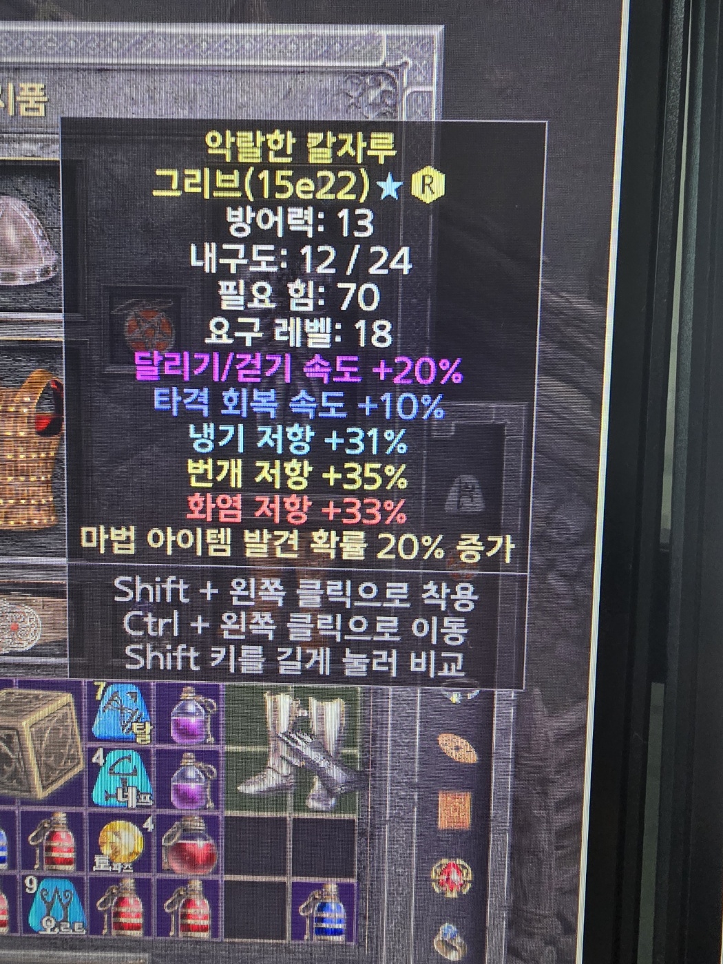 타격회복10 냉기31 번개35 화염33 아이템발견 확률20 입니다. |