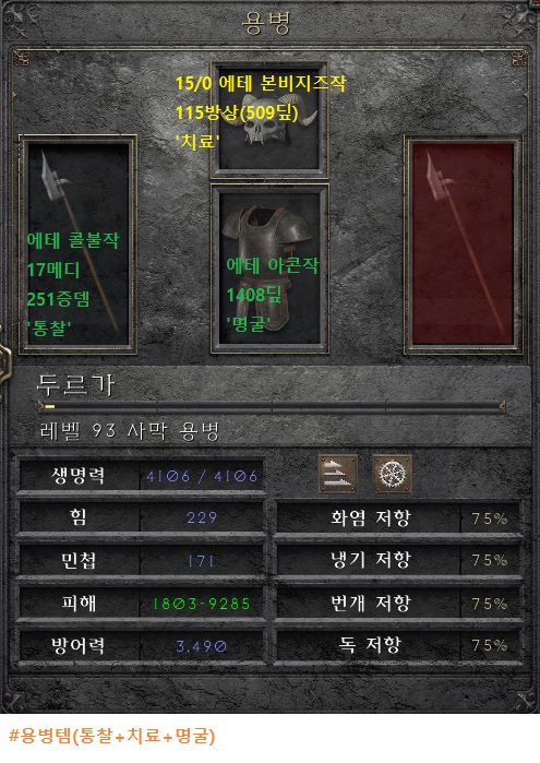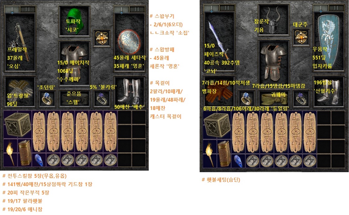 ![]() 쪽지보다는 배틀넷 친추나 오픈카톡이 회신 더 빨라요!!! 배틀태크 : 거기서거기#3341 오픈카톡 : https://open.kakao.com/o/sQj7Wv4g ## check point ## 1. '14k'의 화력 2. 125패캐 3. 슴딘세팅 유무 4. 헬기준 황금레지 다 충족되어있는 세팅입니다. ## 본체(햄딘세팅) ## ★ 머리 : 111딮 토파작 '샤코' ★ 무기 : 프레일작 37올레 '참나무의심장' ★ 방패 : 45올레 세타작 35패캐 '영혼' ★ 갑옷 : 15/0 메이지작 1068딮 '수수께끼' ★ 벨트 : 137딮 '스웹' ★ 신발 : 50매찬 '배추' ★ 장갑 : 96딮 업'트랑장' ★ 반지 : 5% '불카링' ★ 반지 : '조던링' ★ 목걸이 : 2팔라/10패캐/17마나/19올레/48파레/18매찬 '캐스터아뮬' ★ 스왑무기 : 2/6/1(6오더) 크소작 '소집(콜투)' ★ 스왑방패 : 45올레 세론작 '영혼' ## 인벤 ## ★ 거대부적(눈알모양 통일) - 141삥/15상점하락/40매찬 기드참 1장 - 전투스킬참 5장(유옵, 무옵, 잡옵) ★ 작은부적(M자모양 통일) - 20피참 5장(유옵, 무옵, 잡옵) ★ 횃불 : 3/19/17 팔라횃불 ★ 애니참 : 19/20/6 애니참 --------------------------------------------------------------------------- ## 본체(슴딘세팅)## ★ 머리 : 참룬작 '기욤' ★ 무기 : 15/0 페이즈작 40공속 392추뎀 '고뇌' ★ 방패 : 우움작 551딮 업'유닉 자카룸' ★ 벨트 : 7라흡/15뎀감/15마뎀감 '귀꿰미' ★ 신발 : 196방상 '선혈기수' ★ 장갑 : 7라흡/14힘/10이치킬 '뱀파장' ★ 반지 : 6마흡/8라흡/106명중/30라레/6매찬 '듀얼링' [조던링이랑 스왑] ★ 목걸이 : '대군주' --------------------------------------------------------------------------- ##용병템## ★ 머리 : 15/0 에테 본비지즈작 115방상(509딮,으뜸) '치료' [스탠에서는 제작이 안되기에 귀한 매물이며, 그 중에서 제일 인기베이스, 그 중에서 최대딮입니다] ★ 무기 : 에테 콜불작 17메디 251증뎀 '통찰' ★ 갑옷 : 에테 아콘작 1408딮 '명굴' |