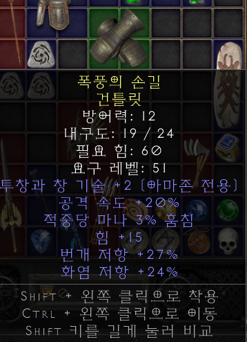 공속20% 적중당 마나 3 힘 15 번개 저항27 화염 저항 24 |