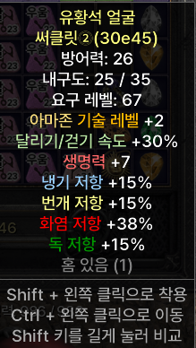 ![]() 30달려 7생명 냉기,번개,독 저항 15 화염저항 38 홈 1 |