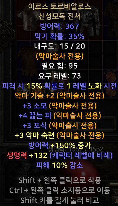 제목 : 유니크 신성모독 전서 아이템 설명 : 아르스 토르바알로스 신성모독 전서 +3 소모 +4 끓는 피 +3 포식 +3 악마 숙련 +150% 방상 +10% 피해감소 |
