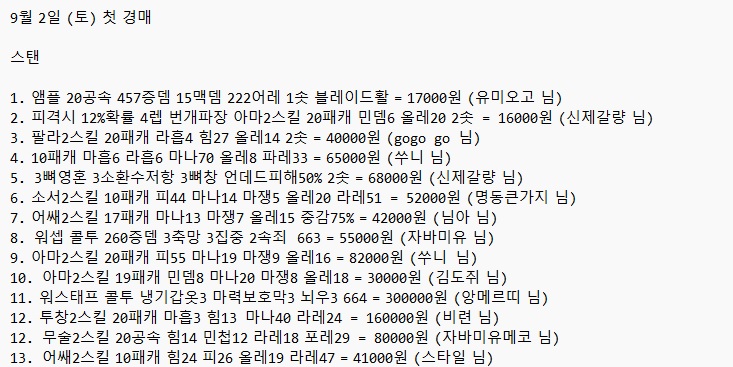 스탠 1. 앰플 20공속 457증뎀 15맥뎀 222어레 1솟 블레이드활 = 17000원 (유미오고 님) 2. 피격시 12%확률 4렙 번개파장 아마2스킬 20패캐 민뎀6 올레20 2솟 = 16000원 (신제갈량 님) 3. 팔라2스킬 20패캐 라흡4 힘27 올레14 2솟 = 40000원 (gogo go 님) 4. 10패캐 마흡6 라흡6 마나70 올레8 파레33 = 65000원 (쑤니 님) 5. 3뼈영혼 3소환수저항 3뼈창 언데드피해50% 2솟 = 68000원 (신제갈량 님) 6. 소서2스킬 10패캐 피44 마나14 마쟁5 올레20 라레51 = 52000원 (명동큰가지 님) 7. 어쌔2스킬 17패캐 마나13 마쟁7 올레15 중감75% = 42000원 (님아 님) 8. 워셉 콜투 260증뎀 3축망 3집중 2속죄 663 = 55000원 (자바미유 님) 9. 아마2스킬 20패캐 피55 마나19 마쟁9 올레16 = 82000원 (쑤니 님) 10. 아마2스킬 19패캐 민뎀8 마나20 마쟁8 올레18 = 30000원 (김도쥐 님) 11. 워스태프 콜투 냉기갑옷3 마력보호막3 뇌우3 664 = 300000원 (앙메르띠 님) 12. 투창2스킬 20패캐 마흡3 힘13 마나40 라레24 = 160000원 (비련 님) 12. 무술2스킬 20공속 힘14 민첩12 라레18 포레29 = 80000원 (자바미유메코 님) 13. 어쌔2스킬 10패캐 힘24 피26 올레19 라레47 = 41000원 (스타일 님) 래더 1. 투창2스킬 20공속 마흡3 힘10 라레29 파레25 + 2. 아마2스킬 10패캐 마나17 마쟁7 올레17 빙감 중감75% = 10만 (무성/나) 3. 어쌔2스킬 10패캐 힘27 민첩18 마나13 마쟁10 올레19 = 35000원 (불도그 님) 4. 무술2스킬 20공속 민첩12 콜레21 라레23 중감25% = 120000원 (불도그 님) 5. 드루2스킬 19패캐 마나13 마재5 올레19 파레56 = 20000원 (갬성쟁이 님) 6. 포노2소환수저항1골렘숙련20착용조건2솟 데몬헤드베이스 독넥방패 + 2강령술사20패캐23힘17올레4이치킬네크뚜껑+ 2강령술사17패캐18올레네크광패아뮬 = 38000원 (갬성쟁이 님) 7. 민뎀8 어레51 마흡6 라흡7 올레11 라레40 = 44000원 (임태균 님) 8. 아마2스킬 30달려 힘23 피48 마나58 2솟 = 110000원 (앰부랄 님) 9. 워셉 콜투 286증뎀 3천주2선고3속죄 664 = 70000원 (자바미유메코 님) 10. 번개2스킬 10패캐 마나96 마쟁6 포레39 중감75% = 36000원 (임태균 님) 11. 물병 2스킬쌍패3맹독2솟 = 28000원 (DOGE COIN 님) 12. 네크완드 3뼈영혼 3뼈창 2저항감소 2솟 = 15000원 (크크 님) 13. 2아마존20패캐30공속38최대피해14힘26파레2솟 아마뚜껑+2패시브20공속넉백 +17라레25중감5쏜즈넉백장갑 = 28000원 (코코 님) 14. 어쌔2스킬 10패캐 민첩20 마나96 마쟁7 올레20 = 100000원 (비련 님) 15. 소서2스킬 10패캐 피4 마나108 마나재생9 올레15 = 35000원 (조성현 님) 16. 어쌔2스킬 10패캐 피60 마나103 마나재생7 올레7 = 46000원 (장봉순 님) 17. 드루2스킬 19패캐 힘20 마나20 마쟁6 올레20 = 25000원 (자바미유메코 님) 18. 무술2스킬 20공속 15힘 민첩15 라레17 파레17 = 150000원 (Joseph Lee 님) 풀템 1. 로제님 (스탠 조독넥 풀템) : 22000원 (갬성쟁이 님) 2. 내꺼 (래더 모자이크 풀템) : 150000원 (요셉 님) 3. 매직님 (래더 사신소서 풀템) : 53000원 (메이플스토리산적 님) 4. 스탠 민뎀마 풀템 : 120000원 (무명 님) 5. 문엘리님 (래더 자벨마 풀템) : 250000원 (루실 님) 6. 농구매니아님 (래더 라스마 풀템) : 400000원 (chang ki kim님) |